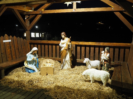 Die ansprechenden Figuren sind fast lebensgroß und ergeben in dem schönen Rahmen und bei abendlicher Beleuchtung eine sehr stimmungsvolles vorweihnachtliches Bild. Bei allen Bürgern und Gästen, vor allem auch bei Kindern, kommt die Krippe gut an.